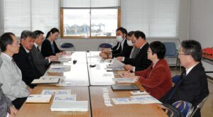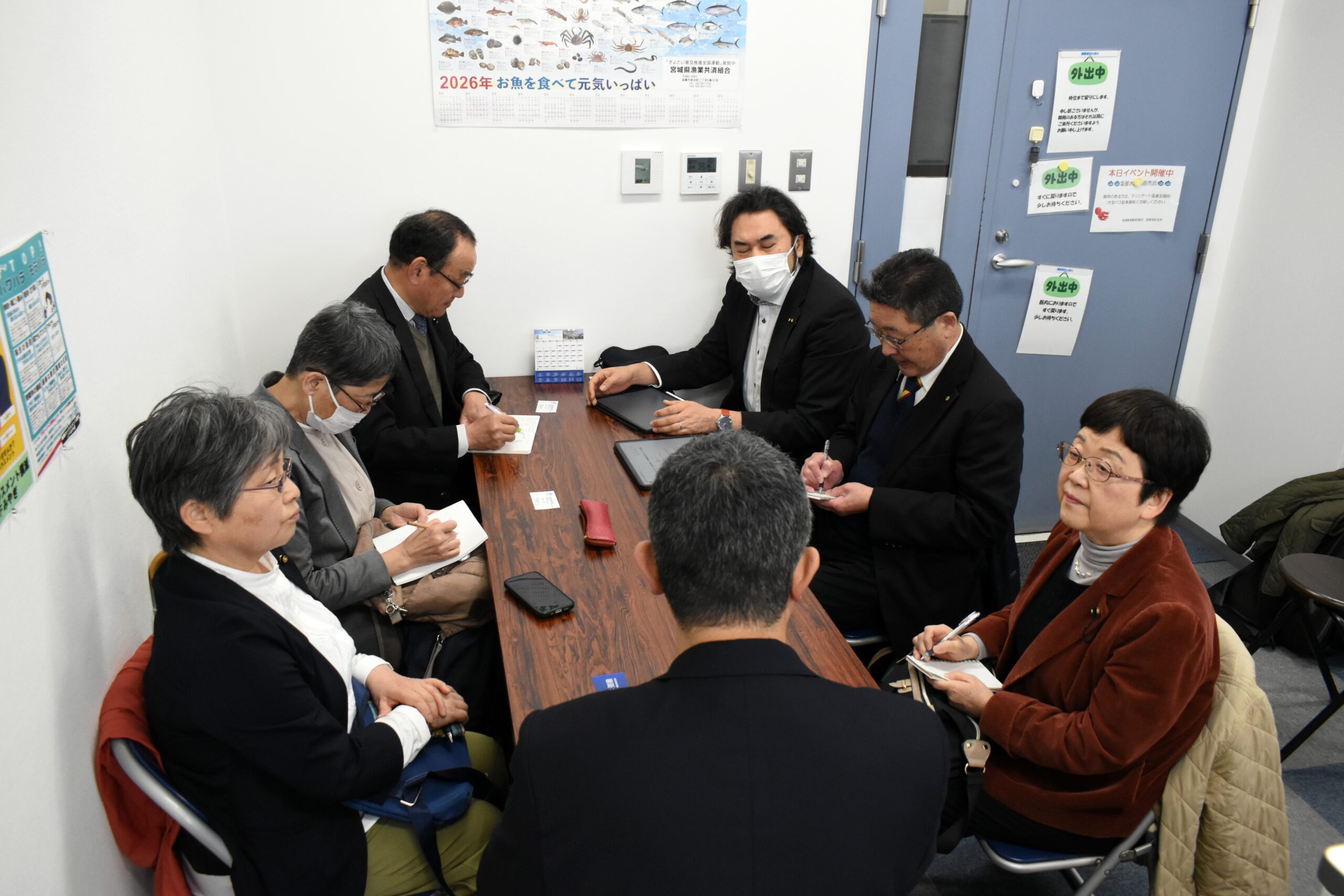 県の仙台地方振興事務所水産漁港部(塩竈市新浜町)では、鈴木永二部長や本庁の水産業基盤整備課・日下啓作課長等と懇談。廃棄するワカメやノリの仮置き場の確保状況を確認し、一刻も早く確定するよう求めました。